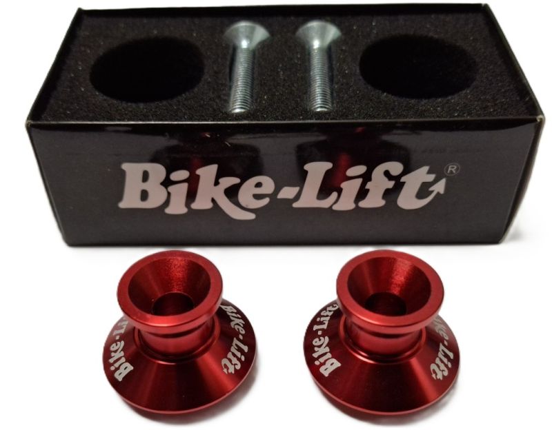 These rollers mount to the factory threaded holes on the motorcycle's swingarm to allow for easy and safe use of a V-shaped rear stand. The bobbins are made of aluminum and are anodized in a variety of colors, available with M6, M8 and M10 threads to fit different motorcycle models.