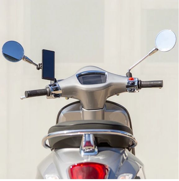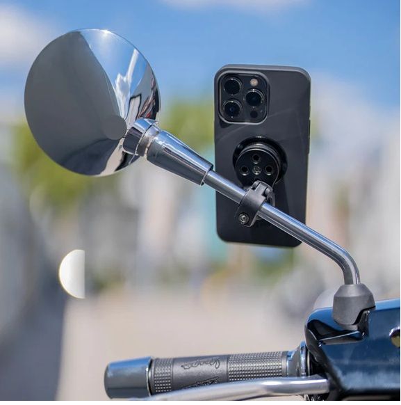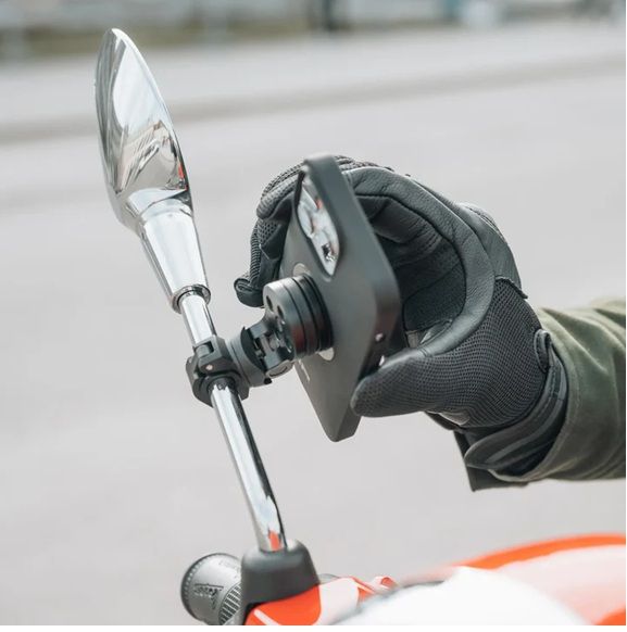 С Mirror Mount Pro, вашият смартфон се монтира бързо и сигурно върху огледалото на мотопеда или мотоциклета.