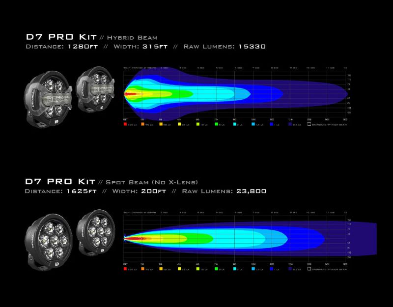Last but not least, the D7 PRO has a "DRL Boost Mode" which allows you to run the center optics as a dim DRL or dial it up to 100% up to create a high-power flood beam. The innovative center optics can also flash in sync with your turn signals when paired with the amber X-Lenses.