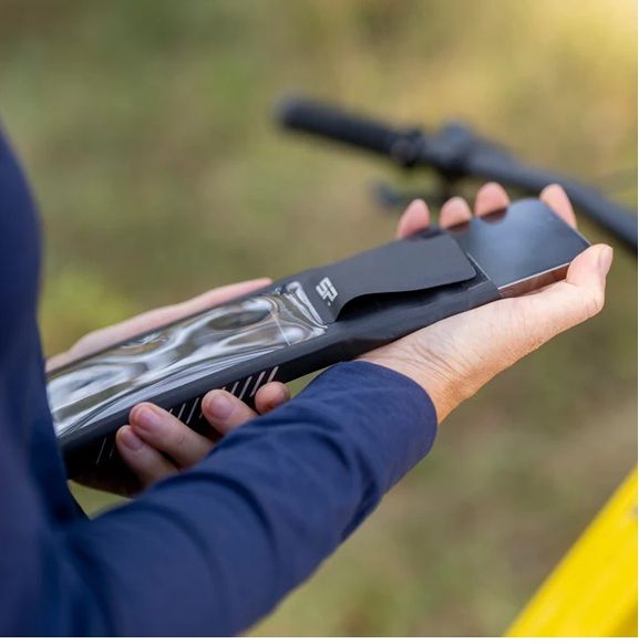 Slide the smartphone into the case, roll down the opening and fix it with the hook & loop surface. The scratch-free fleece insert and the adhesive EVA frame make it possible to find the perfect position for the phone.