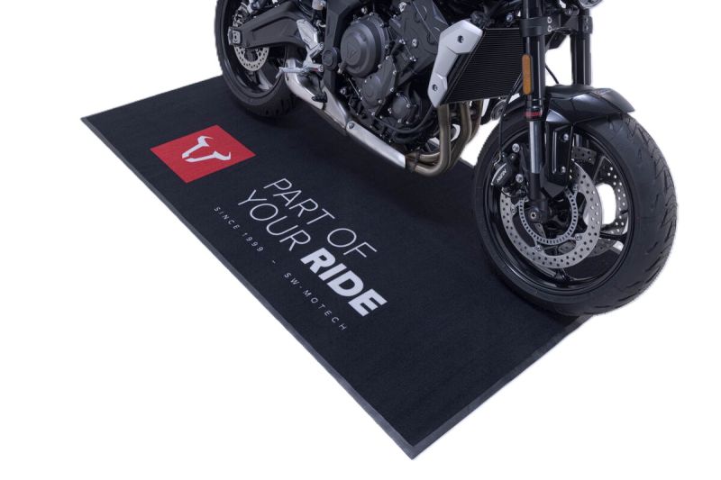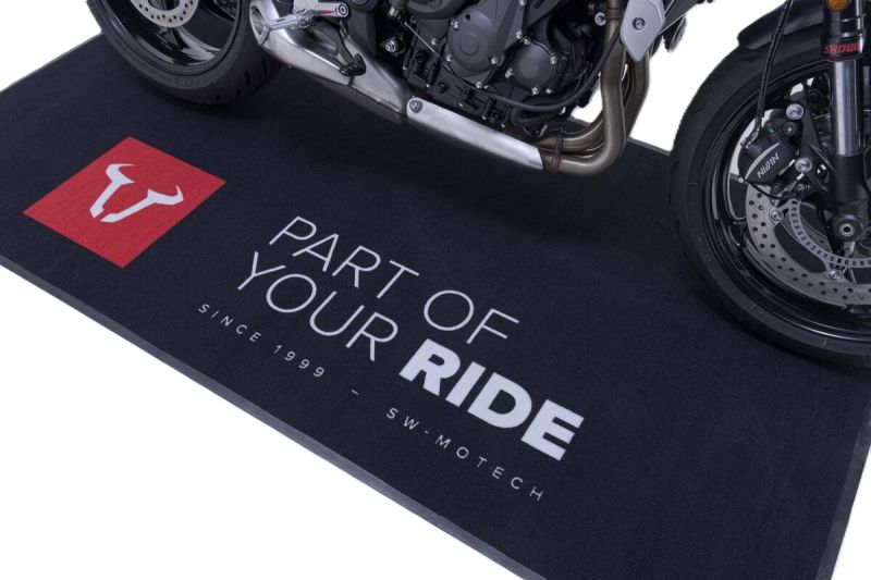 Мотоциклетната стелка с голямо лого на SW-MOTECH е истинска атракция – независимо дали е в шоурума, гаража или работилницата. Стелката не само изглежда добре, но и има отлични материални свойства. Огнеупорна е, абсорбира масло, вода и прах и отговаря на разпоредбите на FIM.
