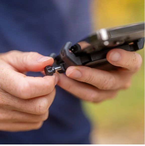 Закрепването на този държач към вашия модел телефон е много лесно и светкавично бързо. Просто издърпайте главата на регулиращия винт, затегнете телефона и фиксирайте, като натиснете главата на винта. Готово.